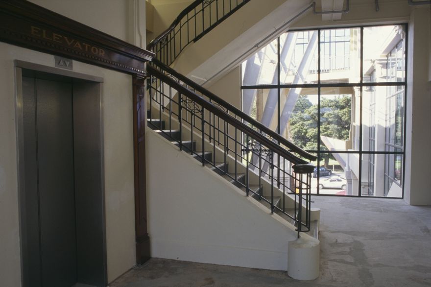 Palmerston North City Library stairwell and lift, 1st floor.