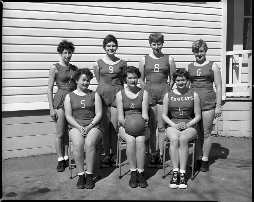 A group of seven female students from the Palmerston North Teachers' College pose with a ball dressed in uniforms emblazoned with the team name "Educats." This negative comes from the Elmar Collection - a large series of semi-identified and unidentified images from the 1930s-1970s.