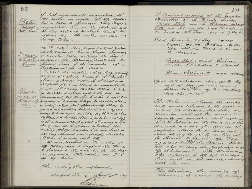 Minutes of annual general meetings and monthly committee meetings of the Manawatu Patriotic Society from 1916-1917. The Manawatu Patriotic Society was formed during World War One for fundraising and welfare purposes. The chairman of the Society's Committee was Mr J A Nash, Mayor of Palmerston North.