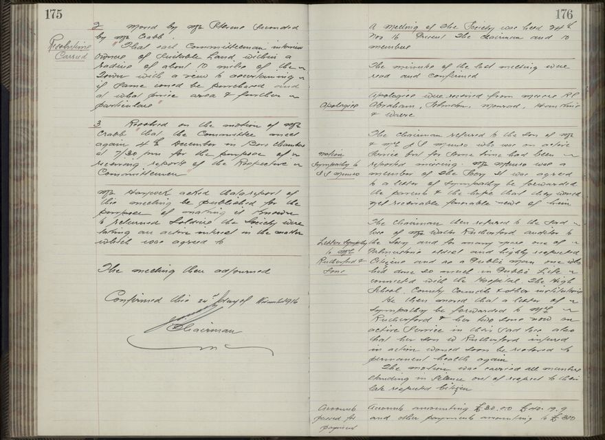 Minutes of annual general meetings and monthly committee meetings of the Manawatu Patriotic Society from 1916-1917. The Manawatu Patriotic Society was formed during World War One for fundraising and welfare purposes. The chairman of the Society's Committee was Mr J A Nash, Mayor of Palmerston North.