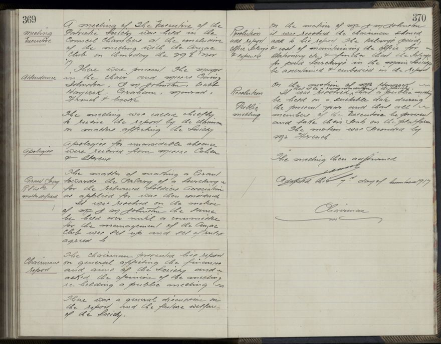 Minutes of annual general meetings and monthly committee meetings of the Manawatu Patriotic Society from 1916-1917. The Manawatu Patriotic Society was formed during World War One for fundraising and welfare purposes. The chairman of the Society's Committee was Mr J A Nash, Mayor of Palmerston North.