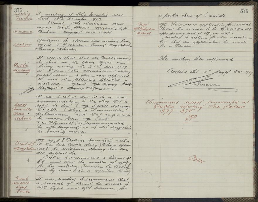 Minutes of annual general meetings and monthly committee meetings of the Manawatu Patriotic Society from 1916-1917. The Manawatu Patriotic Society was formed during World War One for fundraising and welfare purposes. The chairman of the Society's Committee was Mr J A Nash, Mayor of Palmerston North.