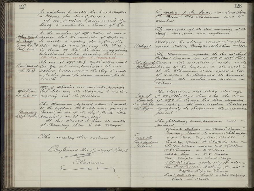 Minutes of annual general meetings and monthly committee meetings of the Manawatu Patriotic Society from 1916-1917. The Manawatu Patriotic Society was formed during World War One for fundraising and welfare purposes. The chairman of the Society's Committee was Mr J A Nash, Mayor of Palmerston North.