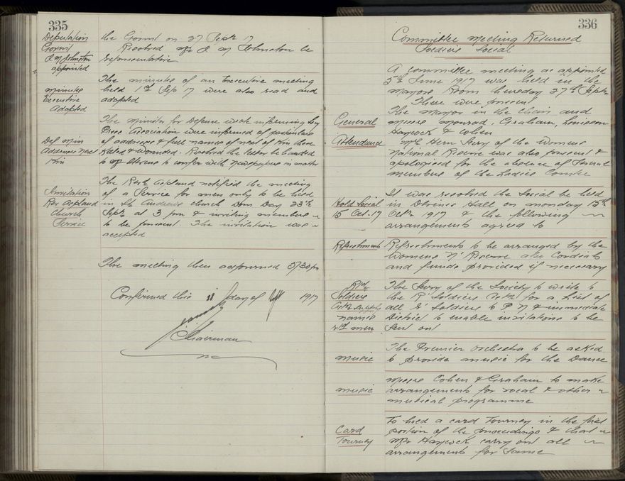 Minutes of annual general meetings and monthly committee meetings of the Manawatu Patriotic Society from 1916-1917. The Manawatu Patriotic Society was formed during World War One for fundraising and welfare purposes. The chairman of the Society's Committee was Mr J A Nash, Mayor of Palmerston North.