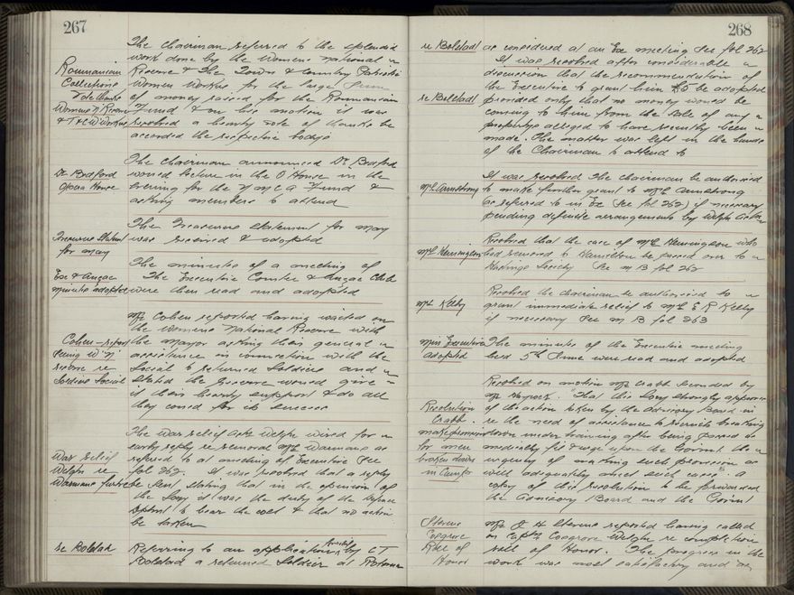Minutes of annual general meetings and monthly committee meetings of the Manawatu Patriotic Society from 1916-1917. The Manawatu Patriotic Society was formed during World War One for fundraising and welfare purposes. The chairman of the Society's Committee was Mr J A Nash, Mayor of Palmerston North.