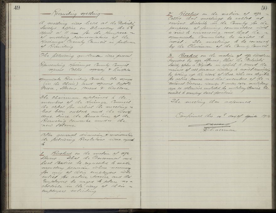 Minutes of annual general meetings and monthly committee meetings of the Manawatu Patriotic Society from 1916-1917. The Manawatu Patriotic Society was formed during World War One for fundraising and welfare purposes. The chairman of the Society's Committee was Mr J A Nash, Mayor of Palmerston North.