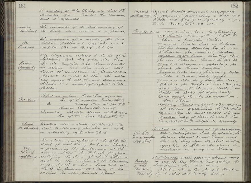 Minutes of annual general meetings and monthly committee meetings of the Manawatu Patriotic Society from 1916-1917. The Manawatu Patriotic Society was formed during World War One for fundraising and welfare purposes. The chairman of the Society's Committee was Mr J A Nash, Mayor of Palmerston North.