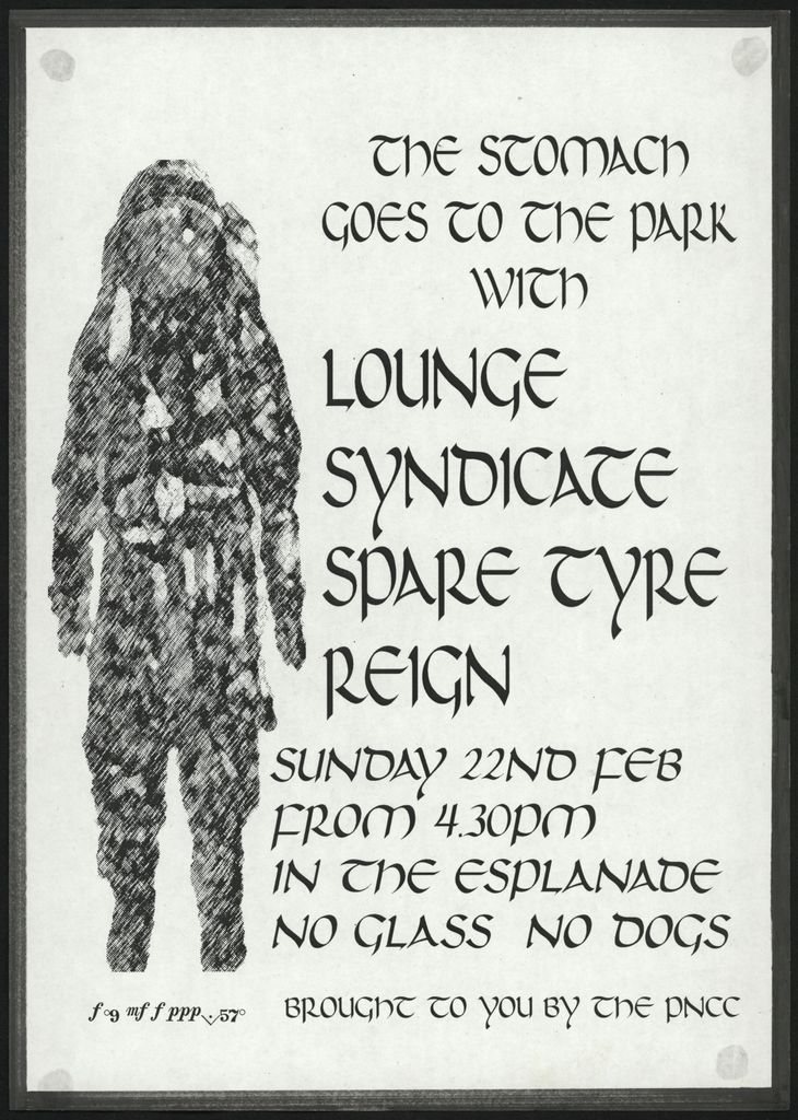 The Stomach Goes to the Park with Lounge, Syndicate, Spare Tyre, Reign. Sunday 22nd Feb from 4.30pm in the Esplanade. No glass. No dogs. brought to you by the PNCC.