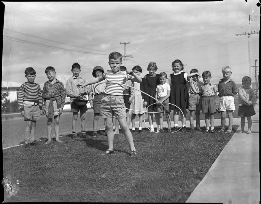 This image was taken for a story that ran in The Manawatu Evening Standard on 04 November 1958: "And today's energetic craze - Hula Hopping. Mark Tutty swings a mean hip to keep the plastic hoop revolving."