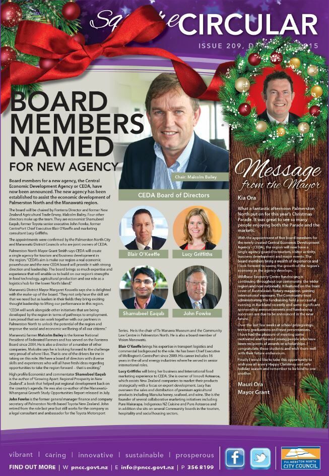 The Square Circular was Palmerston North City Council's monthly community publication, informing Palmerstonians of PNCC initiatives, activites, and events. This month's issue includes: Central Economic Development Agency (CEDA); Malcolm Bailey; Grant Smith; gardening; civil defence; Wildbase Recovery Centre; buses; public transport; Next Step Scholarships; Te Apiti shuttle; Jaycee Trust traveling fellowship scheme winners; councillor contact details; rubbish and recycling dates; Jonah Lomu memory book.