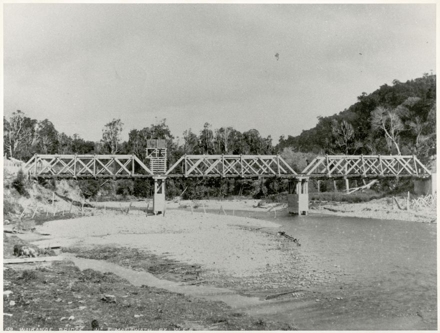 Wellington and Manawatu Railway bridge over Waikanae river [between 1885 and 1888]. See http://www.ipenz.org.nz/heritage/itemdetail.cfm?itemid=625 for more information about this bridge.