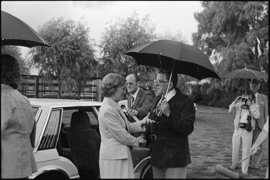 This image was taken by the Evening Standard on the 11th of February 1984 but was not published. It depicts former United States president Jimmy Carter and his wife Rosalynn visiting Highden Park - Herrick and Judy Perry's thoroughbred stud farm at Awahuri.