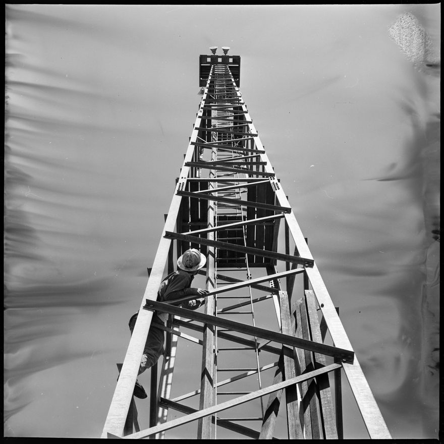 This image was taken for a story that ran in The Manawatu Evening Standard on 26 February, 1964. "Not worried about heights is Mr. C. Silews on the sway of the tower. He and other members of the railway electricity department are wiring the lights on top of five 120ft high towers in the new railway yards at Milson."