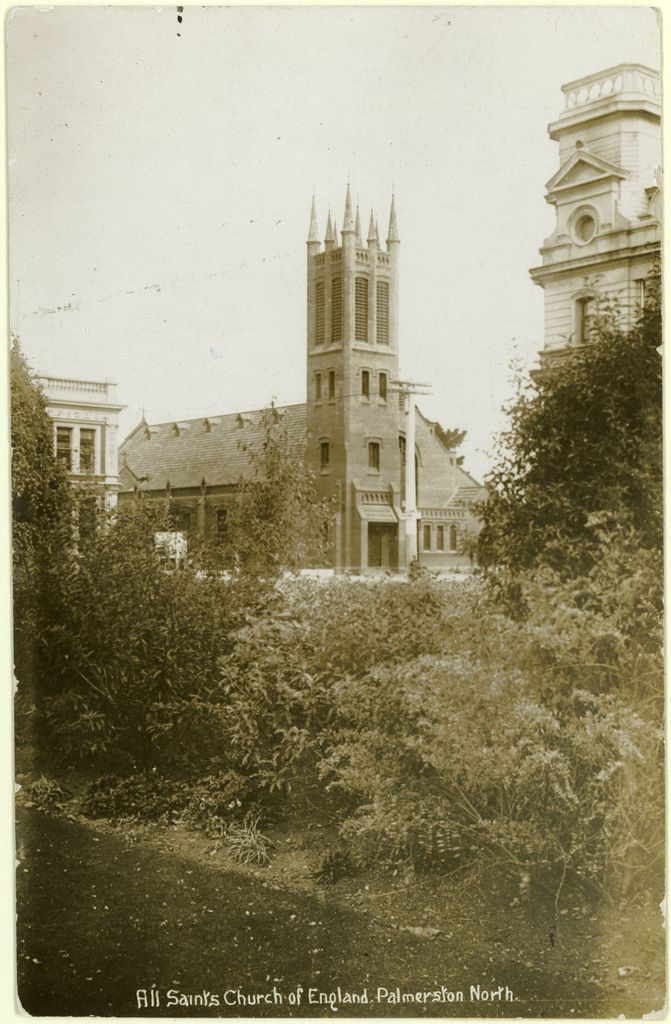 This Anglican church was the third on the site. The first All Saints was built 1875, a second larger building was constructed 1882, incorporating the original building, and the third and current All Saints built in 1914. This image also shows the gardens that once grew in The Square - certainly less manicured than the gardens of today!