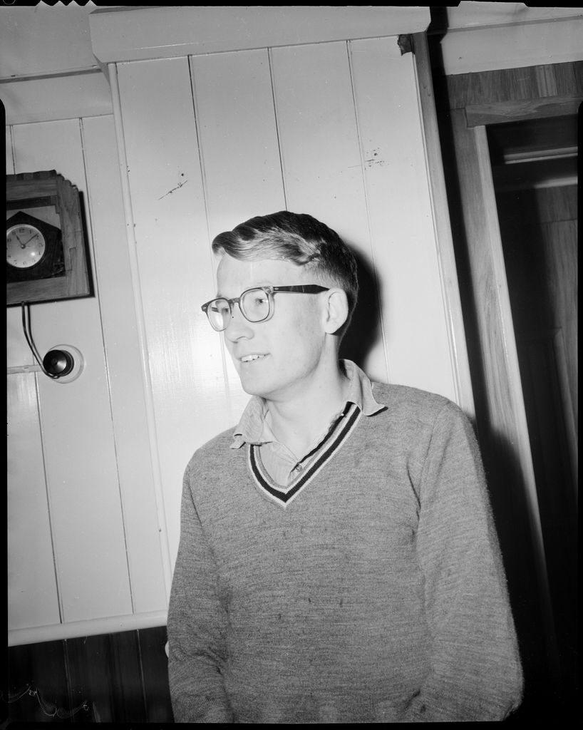 [Photograph of Duxes of City and District Schools: M. Boldt standing inside their school (unknown, possibly Boys' High)."