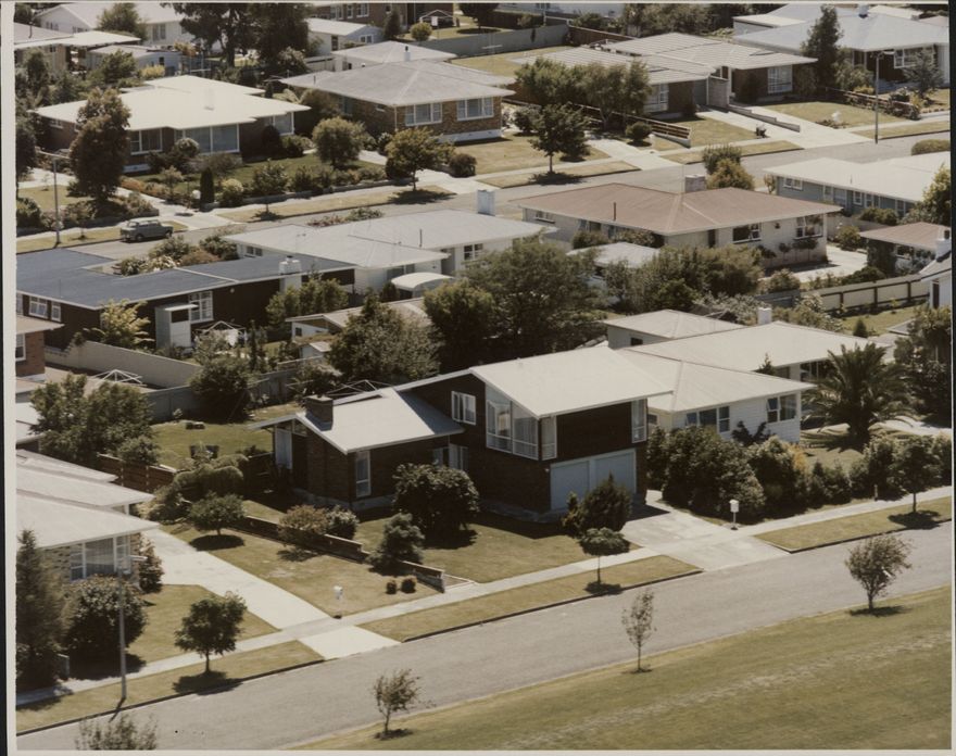 Aerial photograph of houses and properties on and around Centennial Drive.