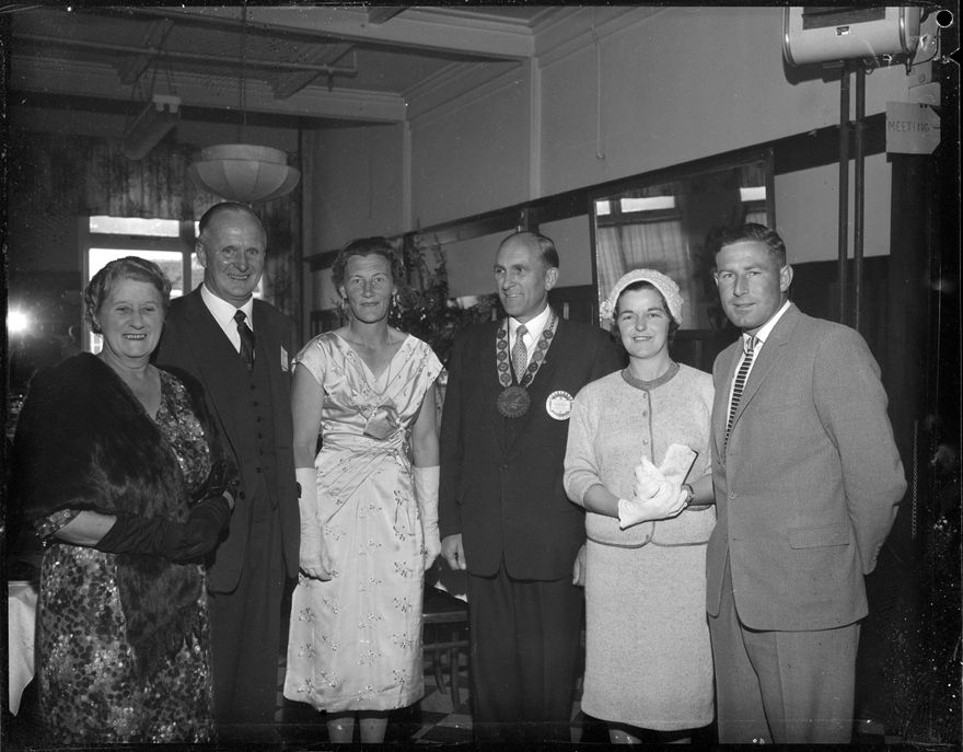 This image was taken for a story that ran in The Manawatu Evening Standard on 22 November 1960 "Guests of the women's night at the Palmerton North Rotary Club were photographed with the president of the club (Mr. L.H. Spencer). They are (from the left): Mrs. and Mr. M.I. Austad, Mrs. and Mr. Spencer and Mrs. and Mr. B. Turner. Mr. Austad was manger of the New Zealand team to the Rome Olympic Games and Mr. Turner was captain of the New Zealand hockey team."