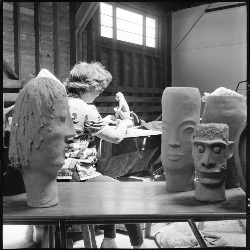 This image was taken for a story that ran in The Manawatu Evening Standard on 21st January 1966 "Included in the groups which have been attending the summer arts school at Massey University is that for ceramic sculpture, under the direction of Mr. T. Johnston, Mrs. F. Williams, of Blenheim, is seen working on a clay figure."
