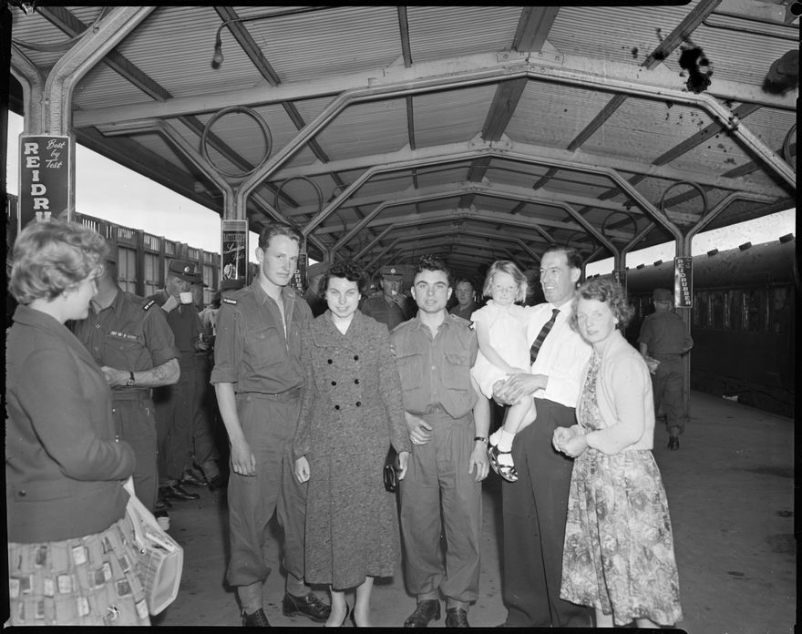 This image was taken for a story that ran in The Manawatu Evening Standard on 6 November, 1959. "D. Ray, of Takaka, was met at the Palmerston North railway station yesterday by his fiancee and future parents-in-law. He is on leave before going to Malaya with the New Zealand troops. From the left are: D. Ray; his fiancee, Miss Margaret Knowles; T. Knowles, who is also going overseas; Mr F. Knowles, holding Sandra; and Mrs G. Knowles."