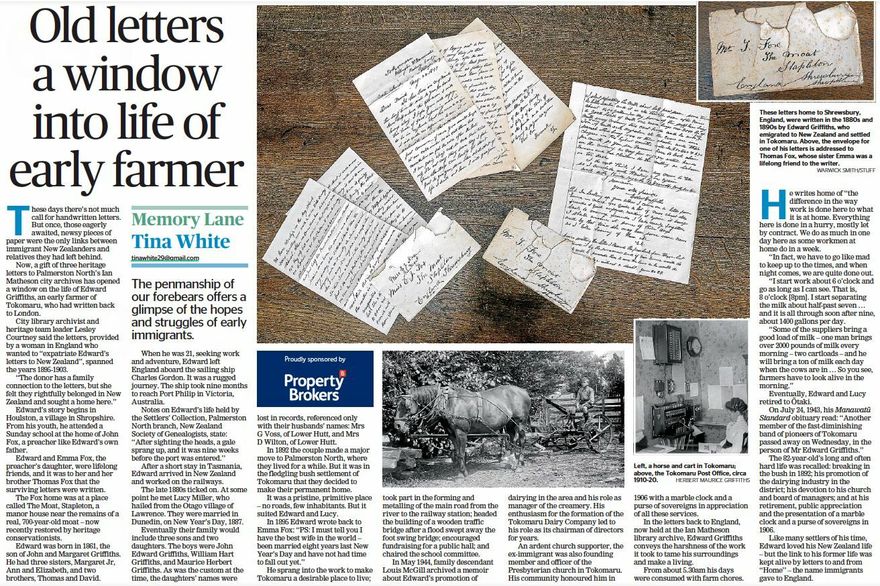 Journalist Tina White's weekly "Memory Lane" article in the Manawatū Standard. Three handwritten letters, written by Tokomaru farmer Edward Griffiths to friends in England, have been donated to the Ian Matheson city archives. The letters describe the life of a settler farmer in Tokomaru in the late 1800's to early1900s.