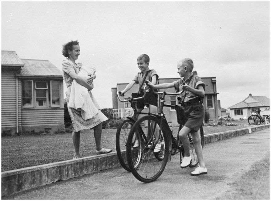 A photographic series prepared by the Prime Minister’s Department in 1947 to attract British migrants. The Evans family of 5 Mansford Place, Palmerston North were selected to show the living conditions of a typical New Zealand family. Betty Evans and baby sees John and Michael off to school. The family had two bikes which were in general use at this time. Betty and Jack Evans biked to work and the boys usually walked about a kilometre to West End School which adjoined the state housing suburb. The family bought a Model A Ford in the 1950s. There were also two younger boys in the family, Tony and Wayne. The baby is Julie Silvester, a neighbour’s baby, chosen to create a picture of the ‘typical’ family of two or three children.
