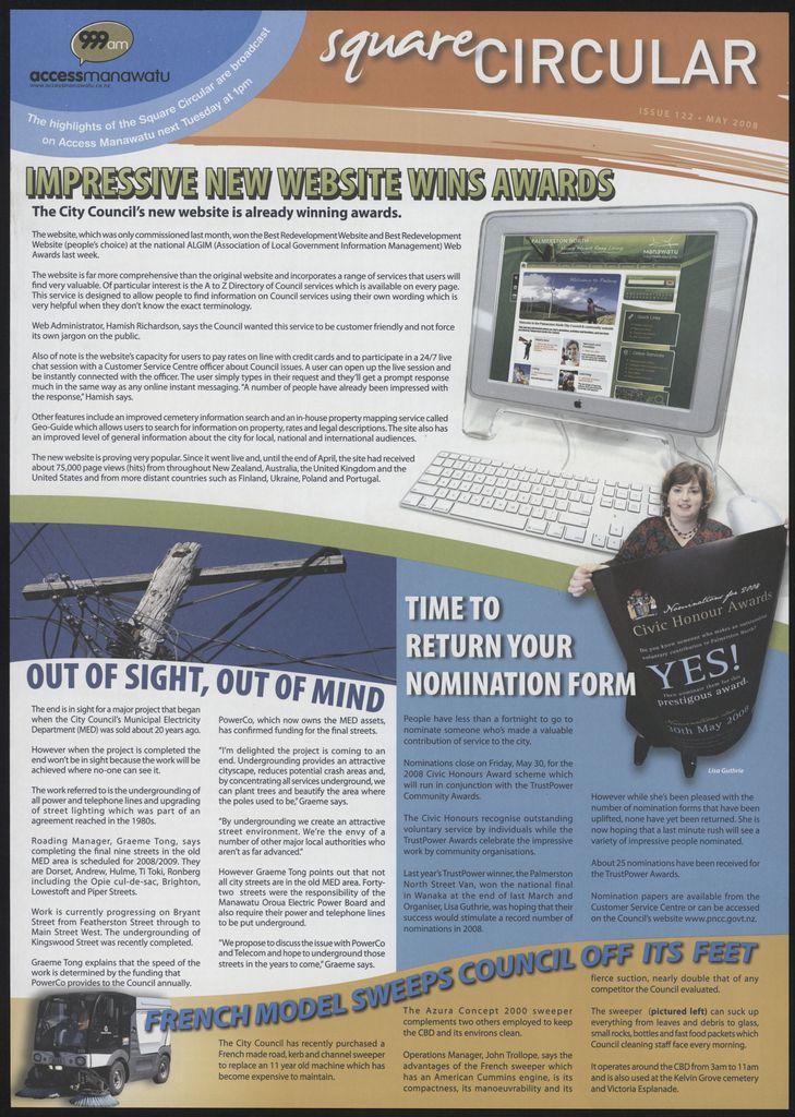The Square Circular was Palmerston North City Council's monthly community publication, informing Palmerstonians of PNCC initiatives, activites, and events. This month's issue includes: Council website, underground power and telephone lines, civic honours, street sweeper, satisfaction survey, New Life Church, planning students, building act forum, volunteer rural fire fighters, Hopwood clock tower, Jaycee travel fund, library, youth council, outdoor art, jazz and blues festival, Te Manawa.