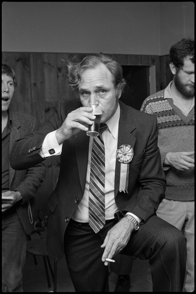 This image was taken by the Evening Standard on Saturday 28th of November 1981 but was not published. It depicts Social Credit leader Bruce Beetham celebrating his successful campaign for the Rangitikei parliamentary seat, with his wife Beverley and various supporters at the Victory Hall in Marton.