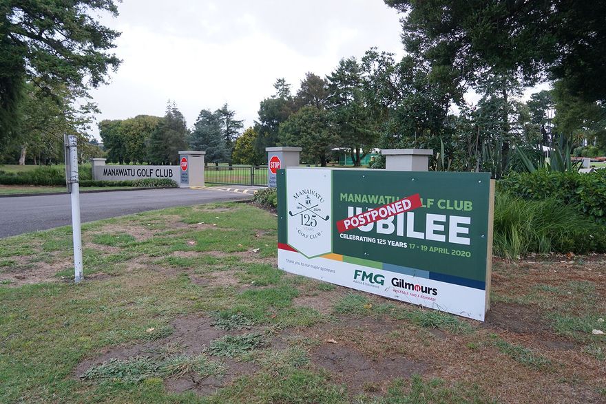 Sign notifying the postponement of the 125th Jubilee of the Manawatū Golf Club due to the COVID-19 pandemic.