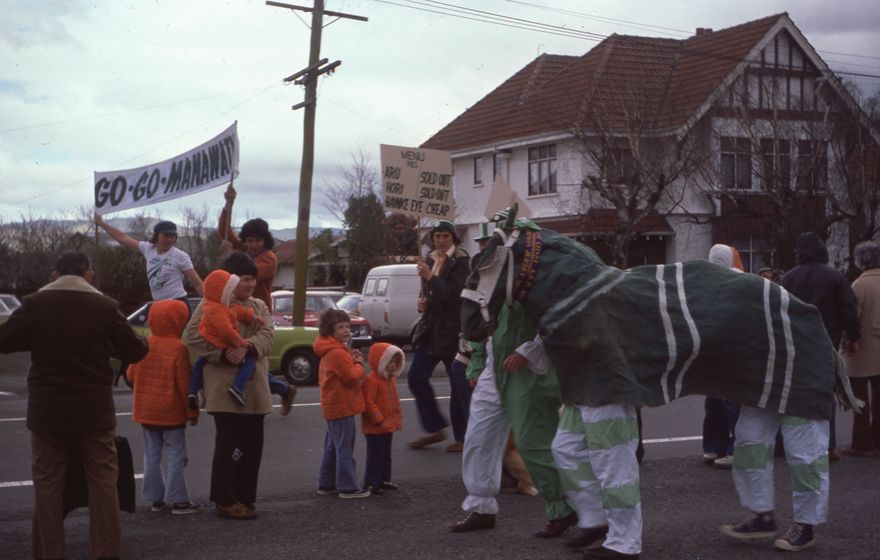 Two people dressed as a horse, with the green and white livery of the Manawatū Rugby team walk along Church Street accompanied by people holding a banner reading "Go-Go-Manawatu" on the occasion of winning the Ranfurly Shield.