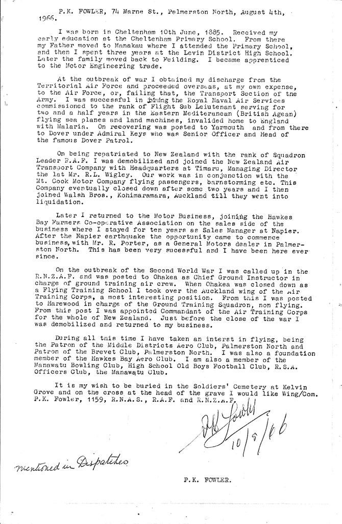 A brief account of Philip Fowler's life, written by Fowler in 1966. P. K. Fowler served in both World War One and World War Two, and was a motor vehicle trader with R Porter in Palmerston North. He always maintained a close interest in flying throughout his life.