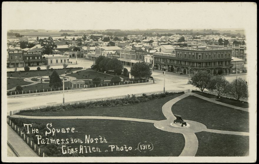 This postcard shows The Square as it was in 1912 and looks towards the section of The Square between Coleman Mall and Rangitikei Street. The base of the fountain that once stood in that section of The Square is just visible in front of the Bon Marche. The cannon in the bottom right corner is one of two bought to Palmerston North in 1909, being surplus equipment of the Defence Department. Both cannons were removed and scrapped during the 1940s.