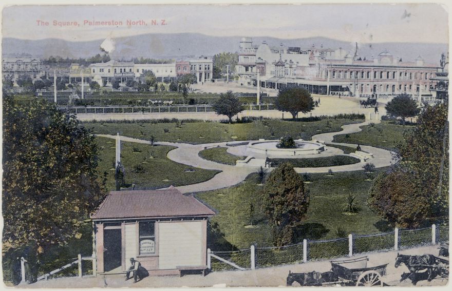 2014P_Sq75_008861 shows a more easterly view, although some of the details are identical. Alterations to the Bank of New Zealand (corner of Square and Fitzherbert Avenue) took place in 1909. The scaffolding appears to still be in tact. This image also shows an interesting view of the stables that used to stand in the middle of the Square near Rangitikei Street, including the sign that reads, "Carrier's Association Phone 227". The Evening Standard building is visible fourth from right has a large sign that reads Ocean Accident - this was an insurance company in Palmerston North until 1910.