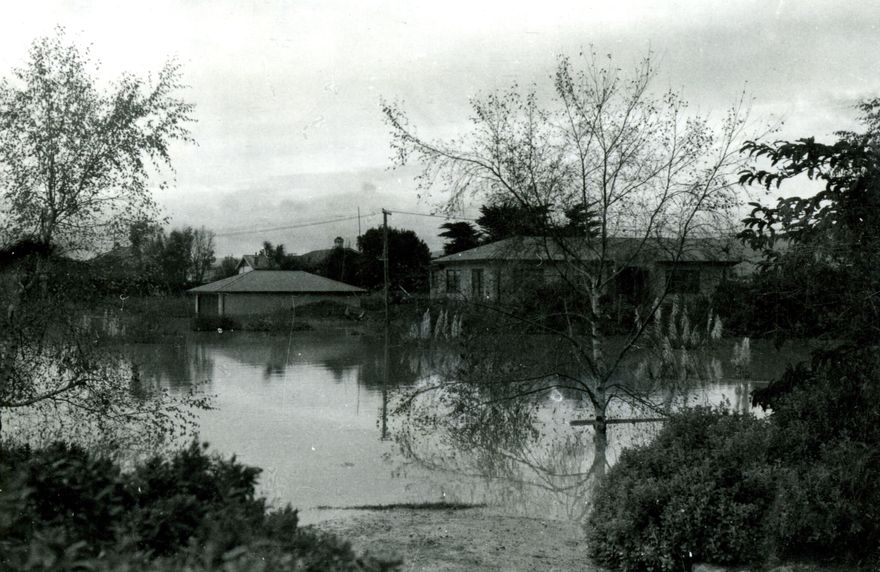 The photograph was thought to have been taken of the corner of Te Awe Awe street and Awatea Terrace, Palmerston North. In May 1941 the Manawatu River flooded about 250 hectares of the city. A stop bank between Fitzroy Street and Jickell Street had been constructed but it proved inadequate for the flood waters.