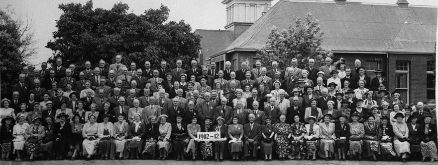 Taken on the occasion of Palmerston North High School's 50th Jubilee. Palmerston North High School was formed as a District High School for girls and boys, the first offering secondary education in Palmerston North in 1902. In 1920 girl's education was separated with the Palmerston North Girls High School in Fitzherbert Avenue being built. Palmerston North Boys High School continued on the Featherston Street site.