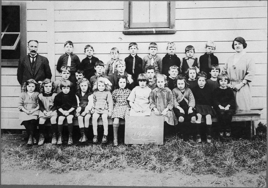 A class of pupils and teachers at Kairanga School. Kairanga School opened 10 December 1888 and is situated 10km from the centre of Palmerston North city on the corner of Rongotea Road and Kairanga-Bunnythorpe Road