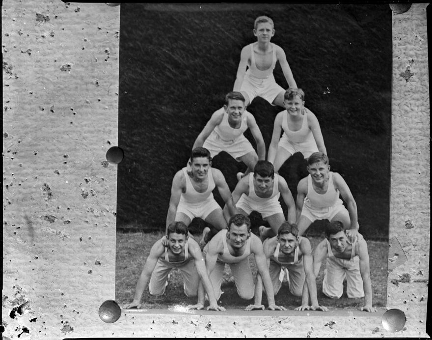 This image was taken for a story that ran in The Manawatu Evening Standard on 01 November 1958: "The physical training group form a pyramid."