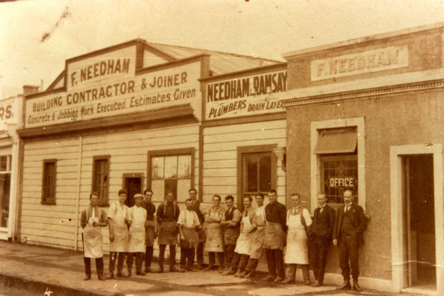 Tradesmen and office staff stand outside the premises of F Needham, Building contractor and Joiners and Needham and Ramsey, Plumbers and Drain Layers. Frederick Needham ran his business from 46 Rangitikei Street and 22 North Street in Palmerston North.