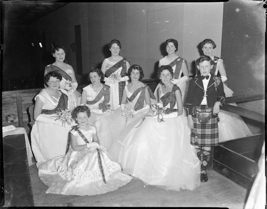 This image was taken for a story that ran in The Manawatu Evening Standard on 2 July, 1959. "Last evening in the Astoria Ballroom eight debutantes made their curtsies to Mr C. S. Thomas, the patron of the Dominion Highland Pipe Bands' Association. Showing from the left are (standing): Misses J. Richardson (Pahiatua), J. Timmins, D. Foote and L. Sutherland. Seated: Misses D. Jackson, A. Douglas (Wanganui), J. Charman, N. Birchall, Kathryn Smith (flowergirl) and Ian Carman (page)."