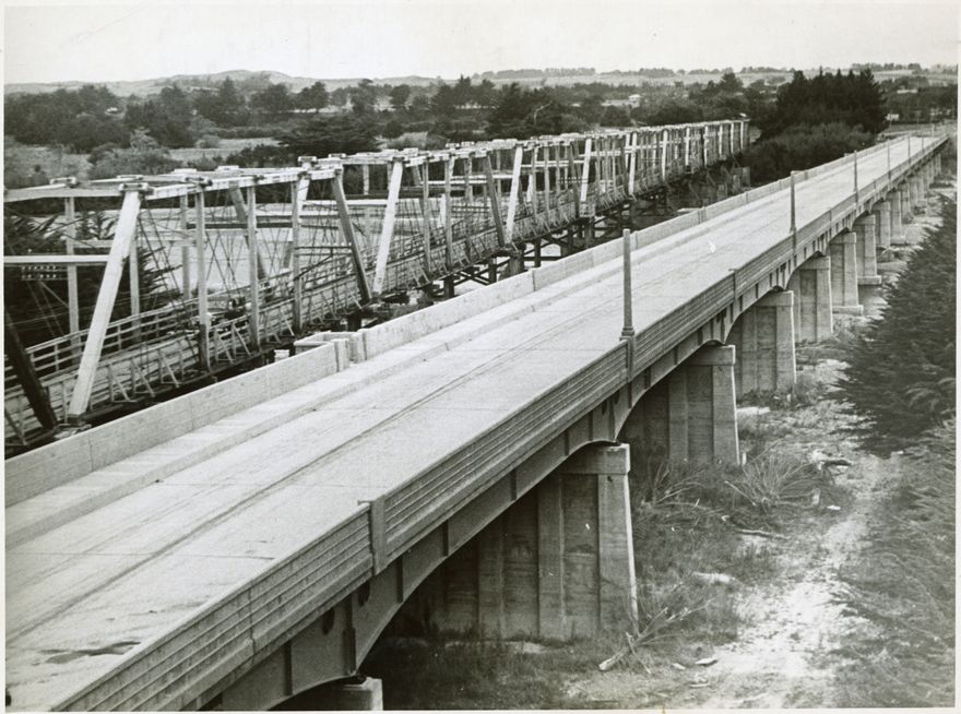 The view of the bridges is from the east. The new bridge was opened on the 19th of March 1949.