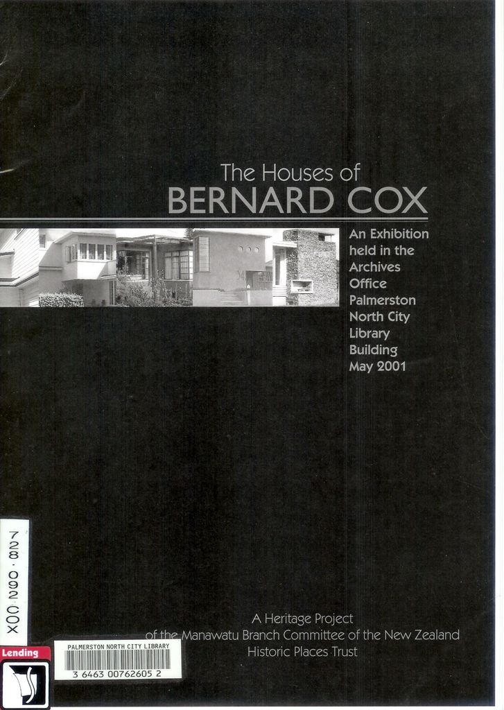 Bernard Cox (1905 - 1970) was a Palmerston North architect. The houses designed by Cox are important as examples of modernism, a major twentieth century movement that revolutionised the way houses are designed and constructed and which expressed the social vision of the mid-twentieth century. This booklet, detailing Cox's life and some of his buildings, was written to accompany an exhibition mounted by the Manawatu Branch of the New Zealand Historic Places Trust.