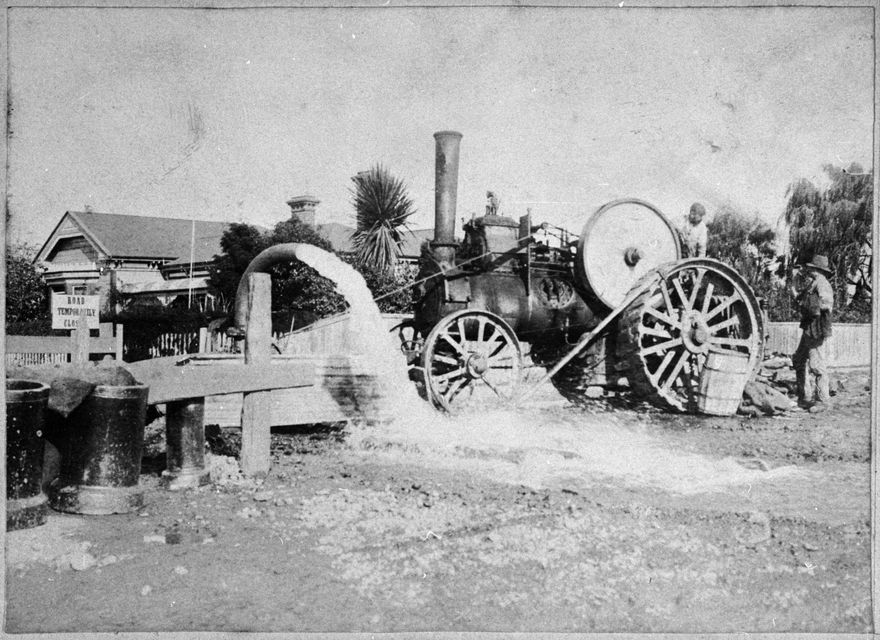 This photograph shows a burst water main at Harry Palmer's residence on the corner of Lombard and Featherston Streets. Water is being pumped from the trench where the main outlet sewer is being laid.