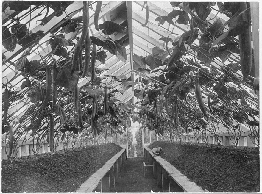 John Nairn established his market garden business at the end of College Street, as it was then, in 1893. In all, seven glass houses and other buildings were built over the years. The family business largely grew tomatoes, cucumbers and grapes. The business was demolished in 1958, to make way for residential growth in the Awapuni area. The photograph shows the cucumber house, looking through into the Vinery. Originally the cucumbers were grown in a bench system but later changed to pit method c1908.