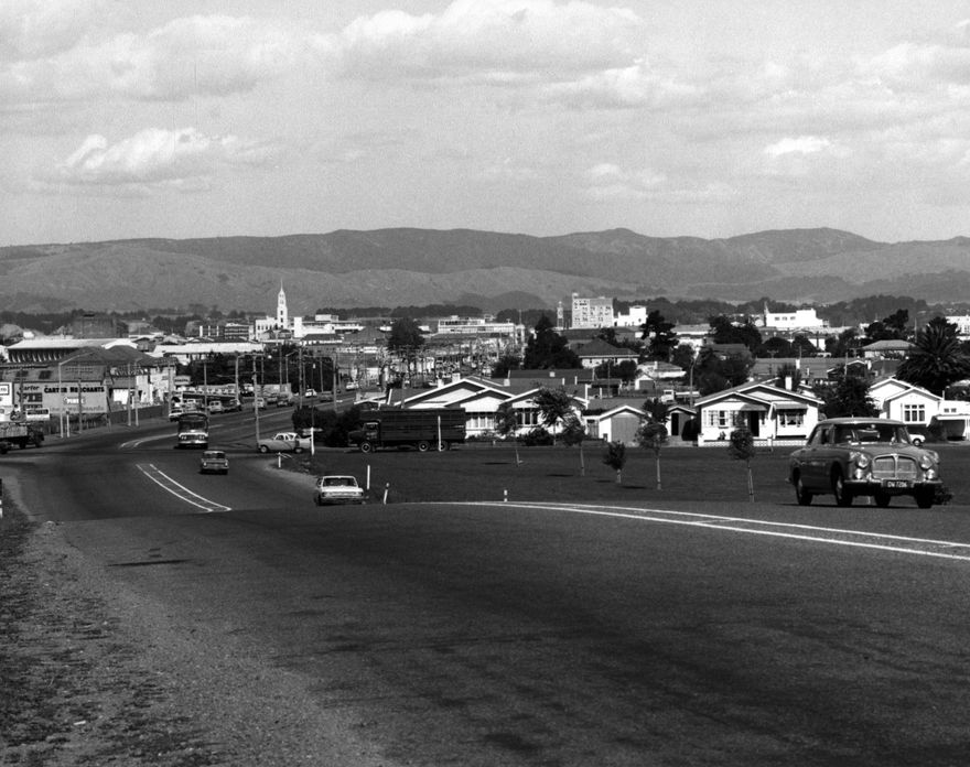 Looking towards The Square, Palmerston North, from the Rangitikei Street railway overbridge, just past the Tremaine Avenue corner. The overbridge was built to accommodate the Main Trunk railway line that was moved from the centre of Palmerston North to the outskirts of the city in the early 1960s. In the distance is the T and G building (left) and the Clock Tower (right of centre ).