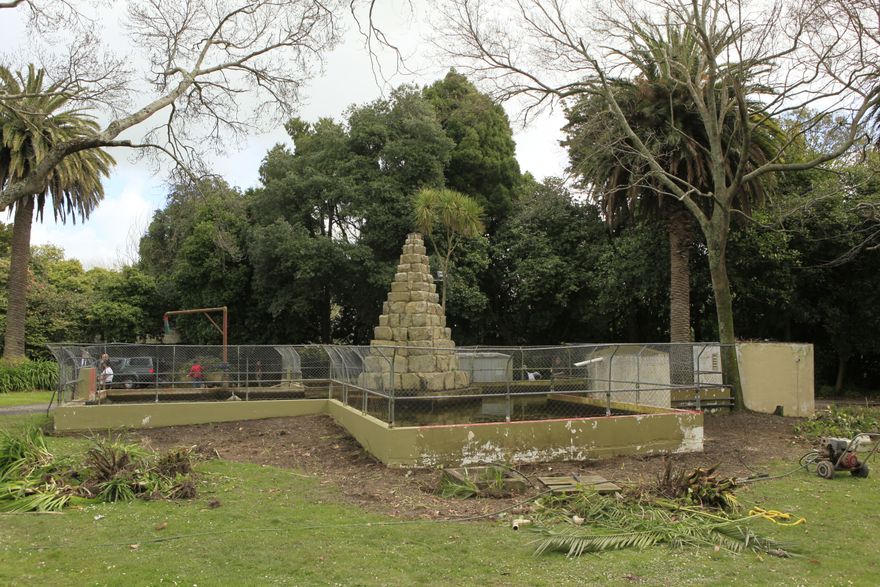 A project got underway in 2014 to clean up and restore the Awapuni Memorial at the Palmerston North Racecourse. This photograph shows some of the early work in clearing the site. The work was carried out by the 2nd Health Support Battalion of the New Zealand Army based at Linton Camp, and Council staff volunteers. The memorial, dedicated to the memory of officers and men of the New Zealand Medical Corps (1914-1918) who were trained at Awapuni Racecourse during WWI, was erected in 1929. The memorial is a stone cairn fountain, inside a pool constructed in the shape of a cross.