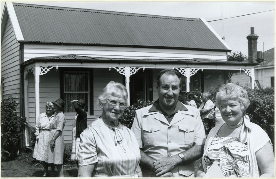 Nancey Kinross (front right) is seen here with some friends outside her newly restored house at 56 Brightwater Terrace. The house was built in 1880 and is notable as a typical example of 1880s architecture. Nancey bought the house in 1979 and since then has spent about $16000 restoring it to its former state. The building is listed in Category Two of the Historic laces Trust because of the architectural significance.