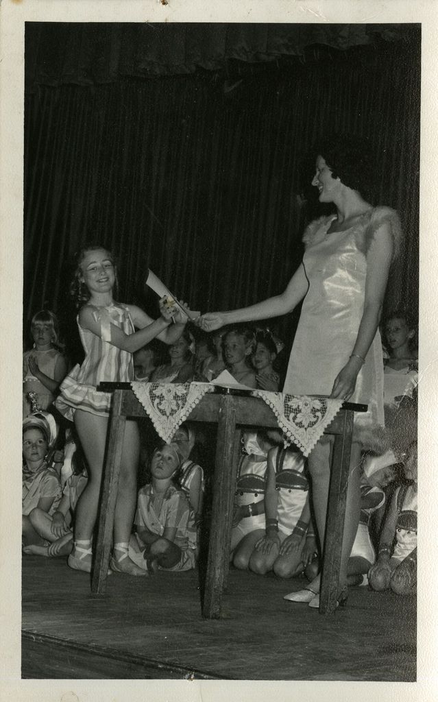 The well-known Palmerston North dance teacher Zona Broughton presents a certificate to a student, believed to be either Karen or Leanne Archer.