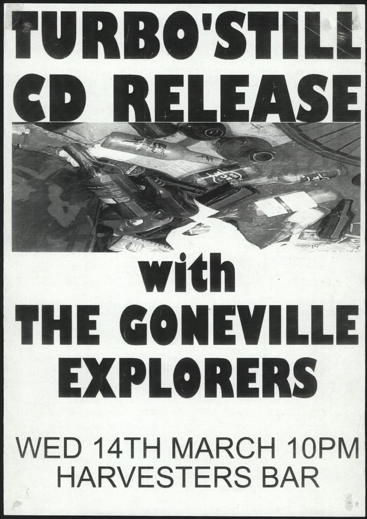 Turbo'still CD Release with the Goneville Exploreres. Wed 14th March 10pm. Harvesters Bar. Part of a collection of posters that were displayed at The Stomach, Lombard Street, venue for Creative Sounds Society Incorporated.