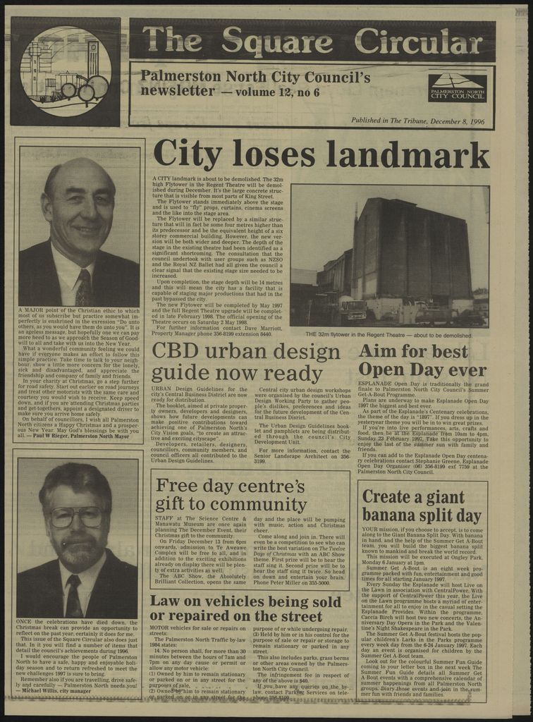 The Square Circular was Palmerston North City Council's monthly community publication, informing Palmerstonians of PNCC initiatives, activites, and events. This month's issue includes: Paul Rieger; Michael Willis; urban design; Esplanade open day; Science centre and Manawatu museum; library; arts committee; summer get-a-bout; annual monitoring report; second bridge; burglar alarms; international representatives funding scheme; Hillary Commission funding; recreational ticket; animal control; visitor information network; Westside.