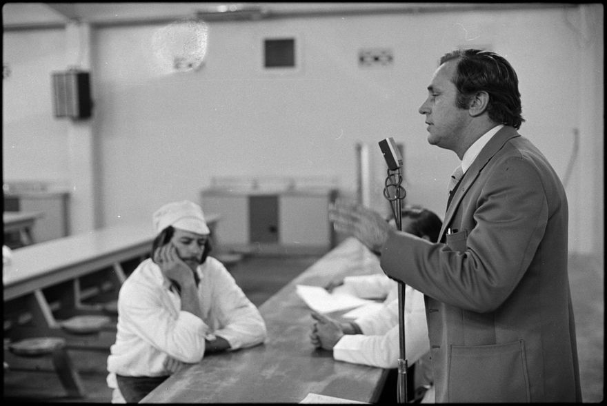 This image was taken by the Evening Standard on the 25th of May 1978 but was not published. It depicts Social Credit leader (and candidate for Rangitikei) Bruce Beetham visiting the Longburn Freezing Works on the campaign trail before the 1978 election.