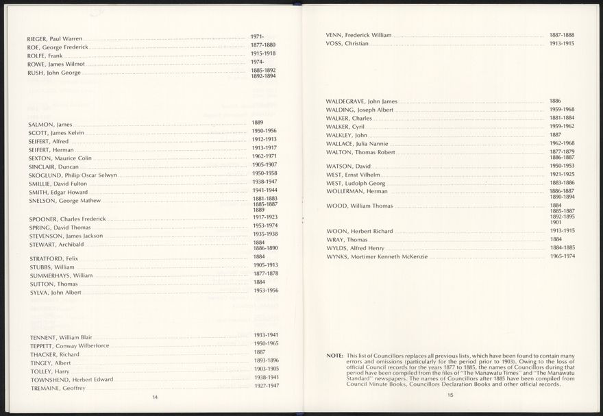 Notice and Order Paper for Special Council Meeting to Commemorate 100 Years of Municipal Local Government in Palmerston North. Included are the meeting minutes from an early council meeting (17 August, 1877), and a listing of Mayors and Councillors from August 1877-August 1977.